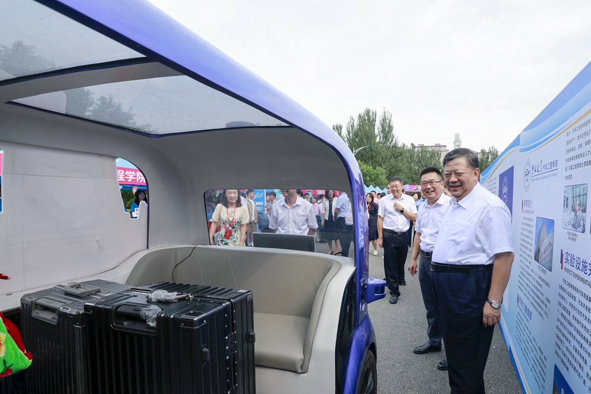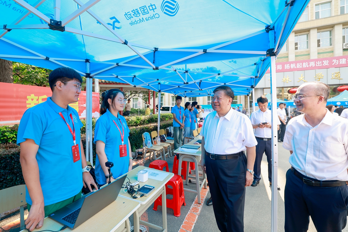 在南岭校区迎新工作现场,姜治莹重点查看了各迎新点位布置情况、学生宿舍准备工作和新生报到路线,详细了解新生报到流程、报到情况、校园环境维护及安保情况,现场观摩无人行李车运行展示。来自湖北的张同学报到前不慎摔伤,为了能使其顺利入学,学校相关部门特事特办、精准服务,专门提供“爱心轮椅”,缓解了她因行动不便造成的焦虑不安。姜治莹向她表示慰问,叮嘱校医院等部门,全力以赴做好张同学康复治疗的协调、衔接工作,采取更多人性化举措,创造良好条件,帮助她尽快恢复。