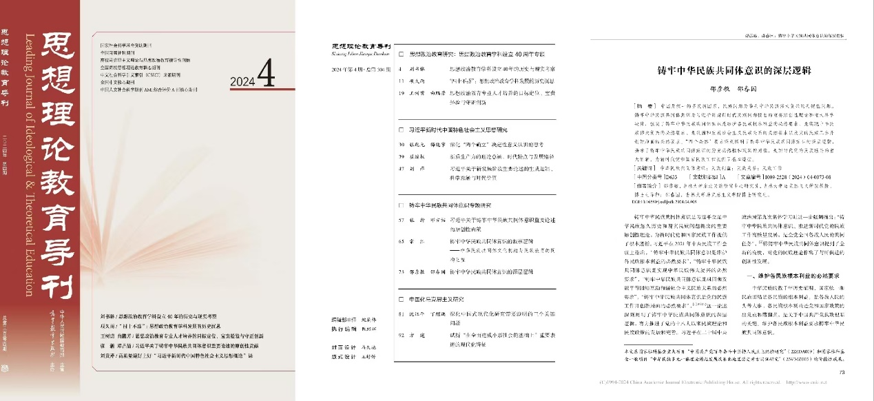 近日,吉林大学东北民族研究中心专家邵彦敏教授在《思想理论教育导刊》2024年第4期发表题为《铸牢中华民族共同体意识的深层逻辑》的文章。