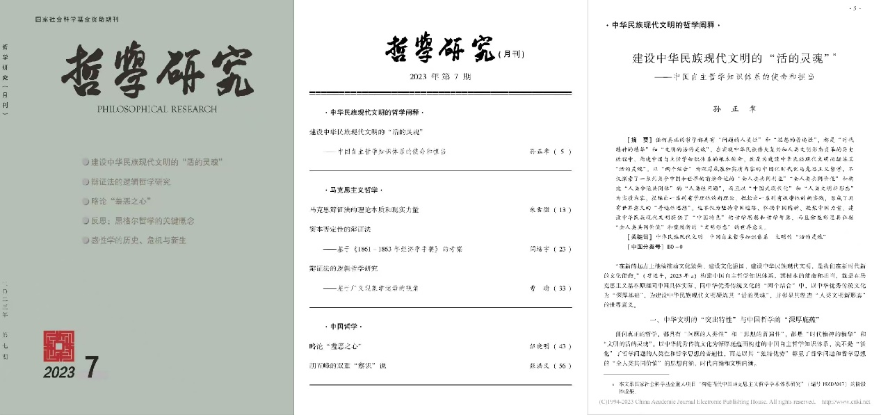近日,吉林大学东北民族研究中心专家孙正聿教授在《哲学研究》2023年第7期发表题为《建设中华民族现代文明的“活的灵魂”——中国自主哲学知识体系的使命和担当》的文章。